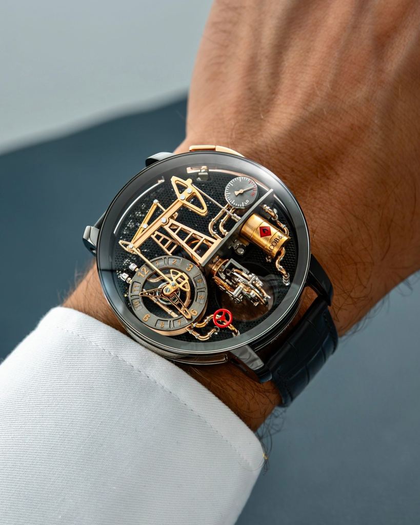 This is a Jacob & Co. Oil Pump watch in a 44mm or 49.5mm case. It features an intricate automaton oil derrick powered by the JCAM33 or JCAM53 caliber movement. The watch has a flying tourbillon and the oil rig mechanism can be activated on demand via a push button. The dial base is designed to look like an oil rig grill, complete with pipes and a power reserve indicator resembling an oil pressure gauge.