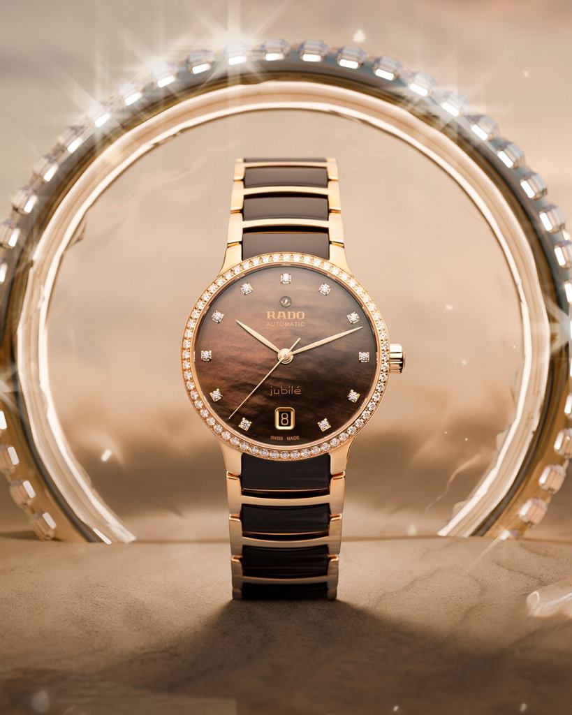 The Rado Centrix Automatic Diamonds watch is a luxury timepiece featuring a rose-gold-colored PVD-coated stainless steel case, a mother-of-pearl dial adorned with 11 shimmering diamonds, and a diamond-set bezel.